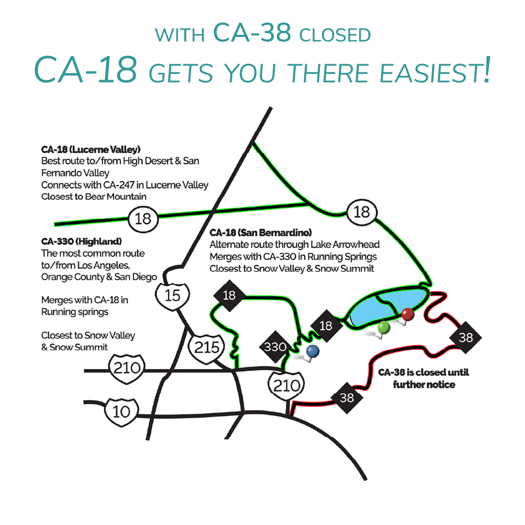 To ensure your journey to this winter wonderland is smooth, please note that Highway 38 through Redlands is closed for repairs. The easiest and most recommended route is to take CA-18 through Lucerne Valley, or alternatively, you may take CA-330 through Highland.